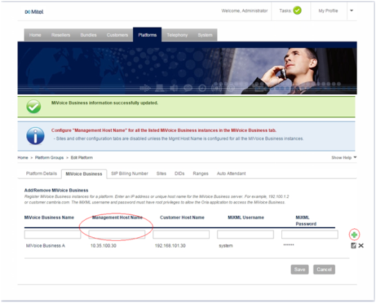 After MiCollab is registered, the MiVoice Business tab lists any MiVoice Business nodes that you add to MiCollab. By default MiVoice Business displays its own IP Address as configured in the Customer Network (the Customer Host Name field). Use the following procedure to configure the Management Host Name so that Oria can access the MiVoice Business from the Service Provider network.