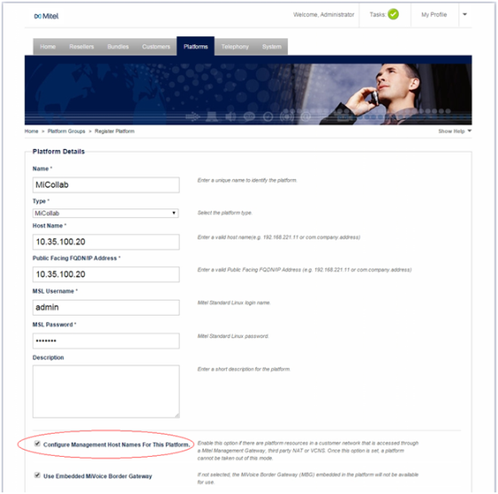 2 Select Configure Management Host Names For This Platform. This information tells Oria that the MiCollab is deployed in a NAT network.